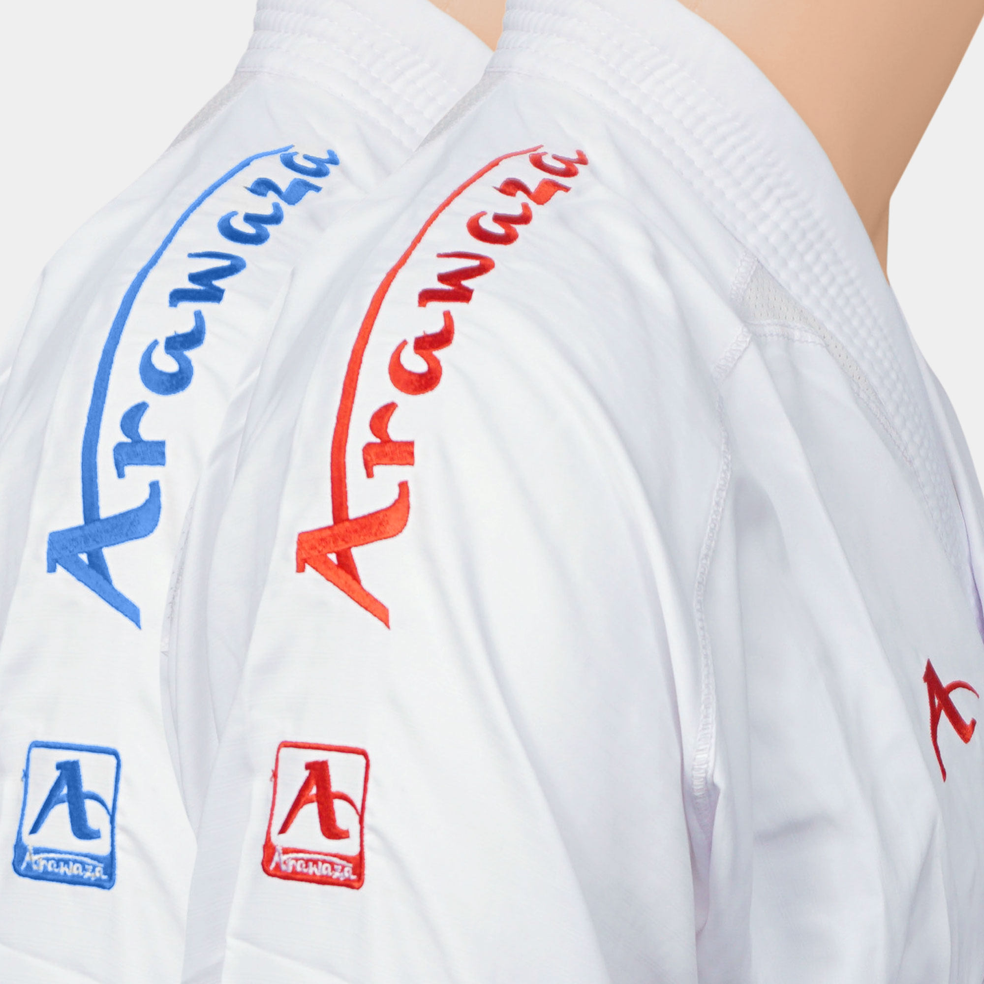 The Arawaza Kumite Deluxe EVO, WKF Combo Kit includes two jackets (one Jacket with Red embroidery, one Jacket with Blue embroidery) and one pants.